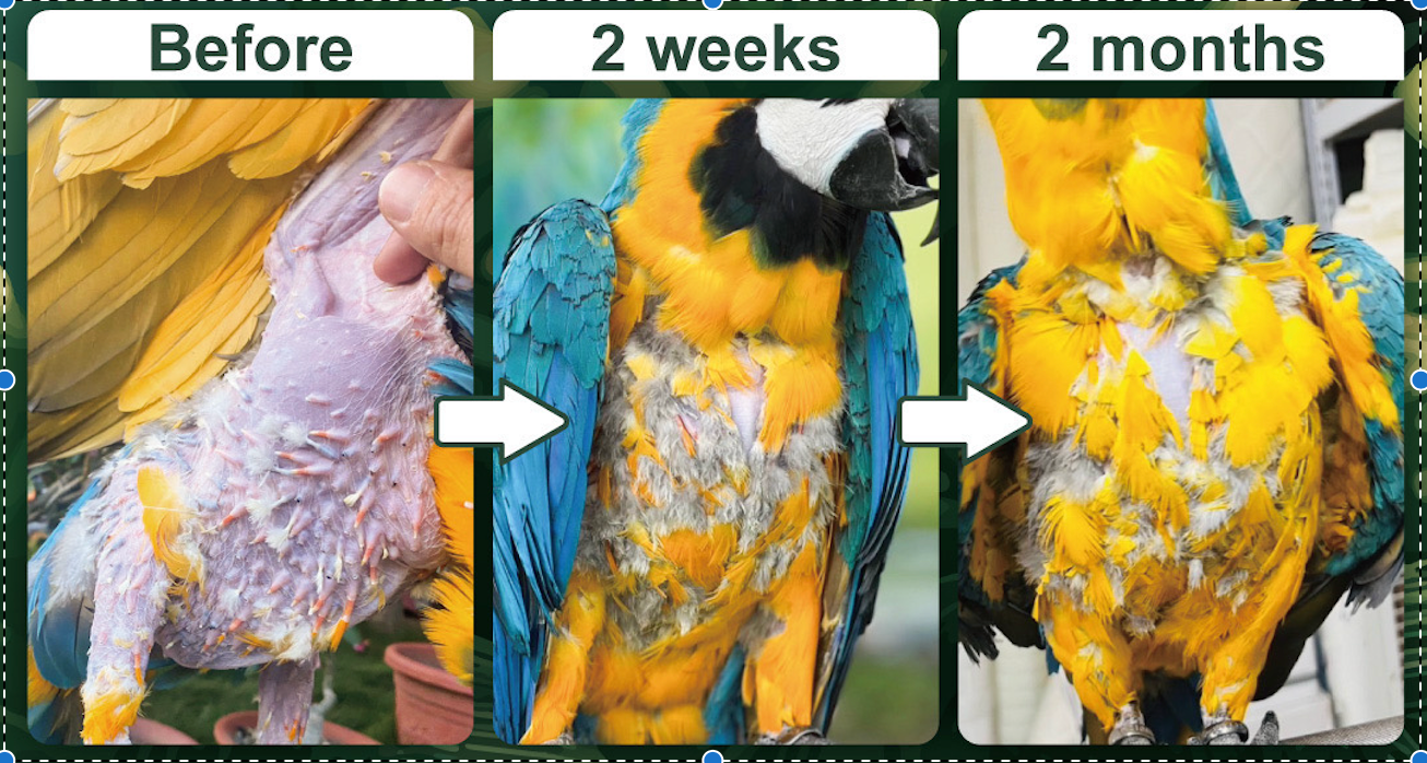- Clinically Proven Results: Tested successfully on parrots of 13 species. Most birds stopped feather-pecking behavior within just one week. Full feather recovery observed within 2–4 months.
